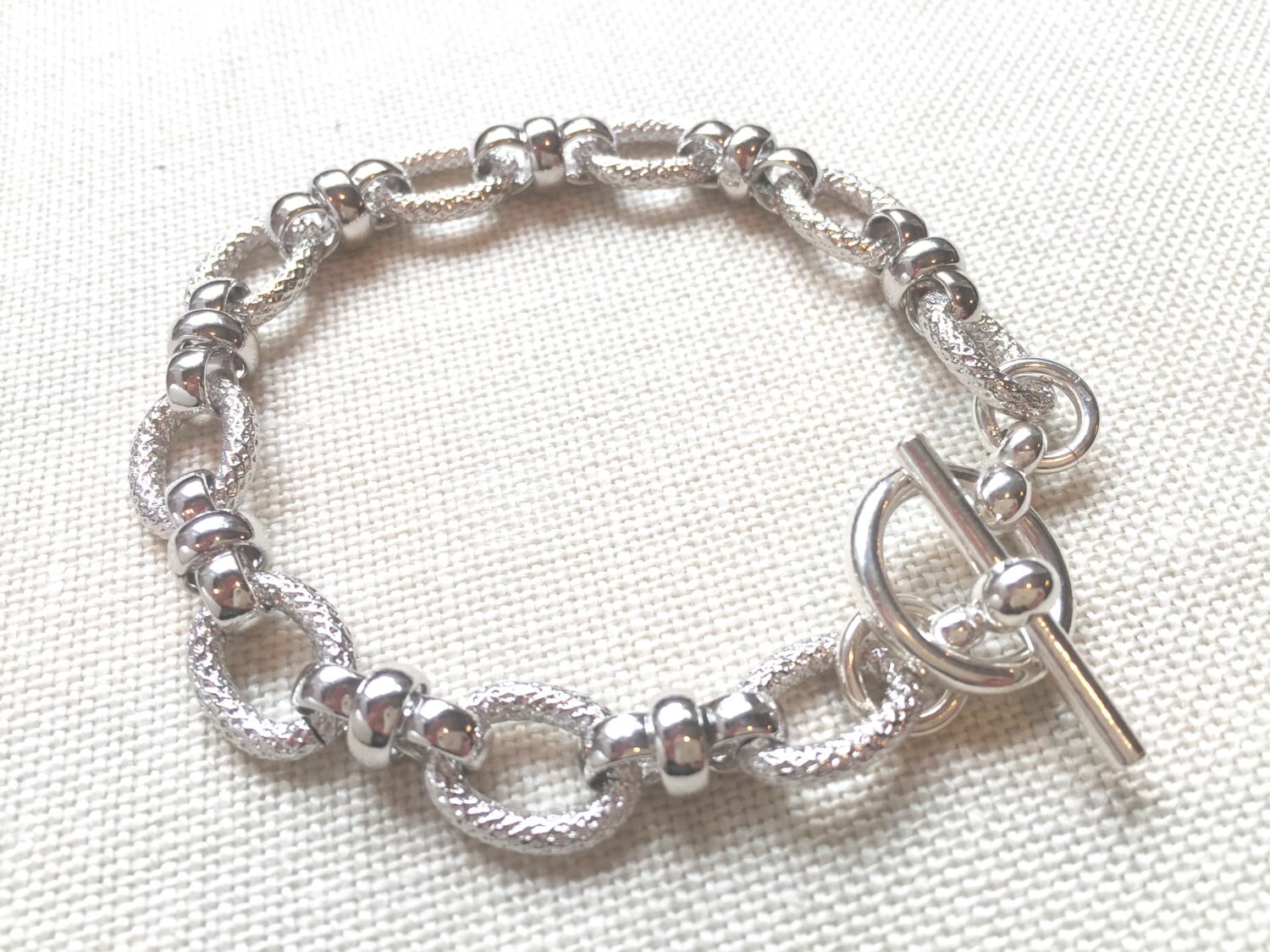 This lovely rhodium plated chain link bracelet is perfect by itself or as a layering piece with other bangles and bracelets. You will love the weight and drape of these links.